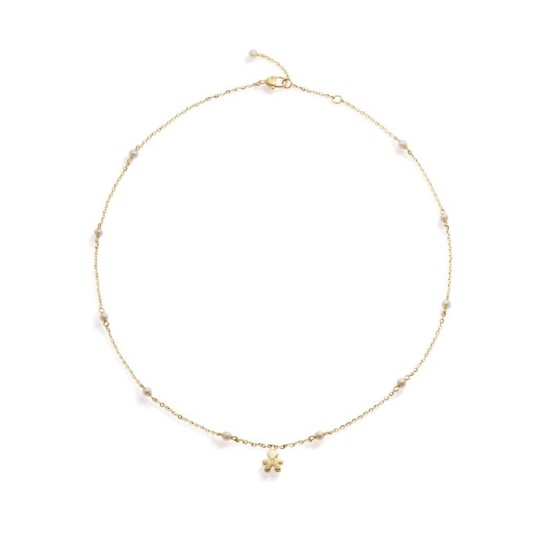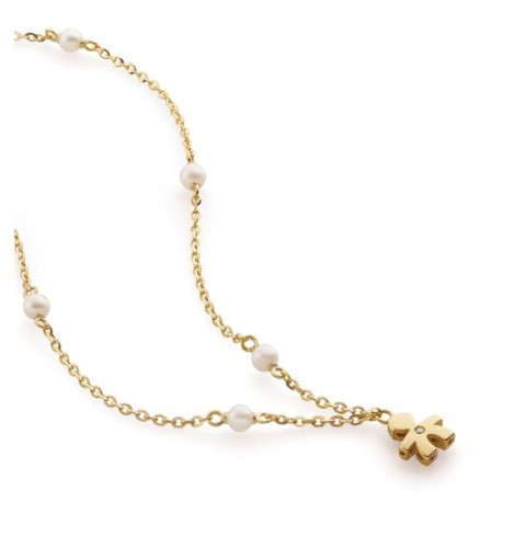 Collana in oro giallo 9kt con perle diametro 3-3,5 e brillantino sulla sagoma. Lunghezza 40-42 cm regolabile con maglietta. Chiusura moschettone. Collezione Le Perle. Referenza LBB831