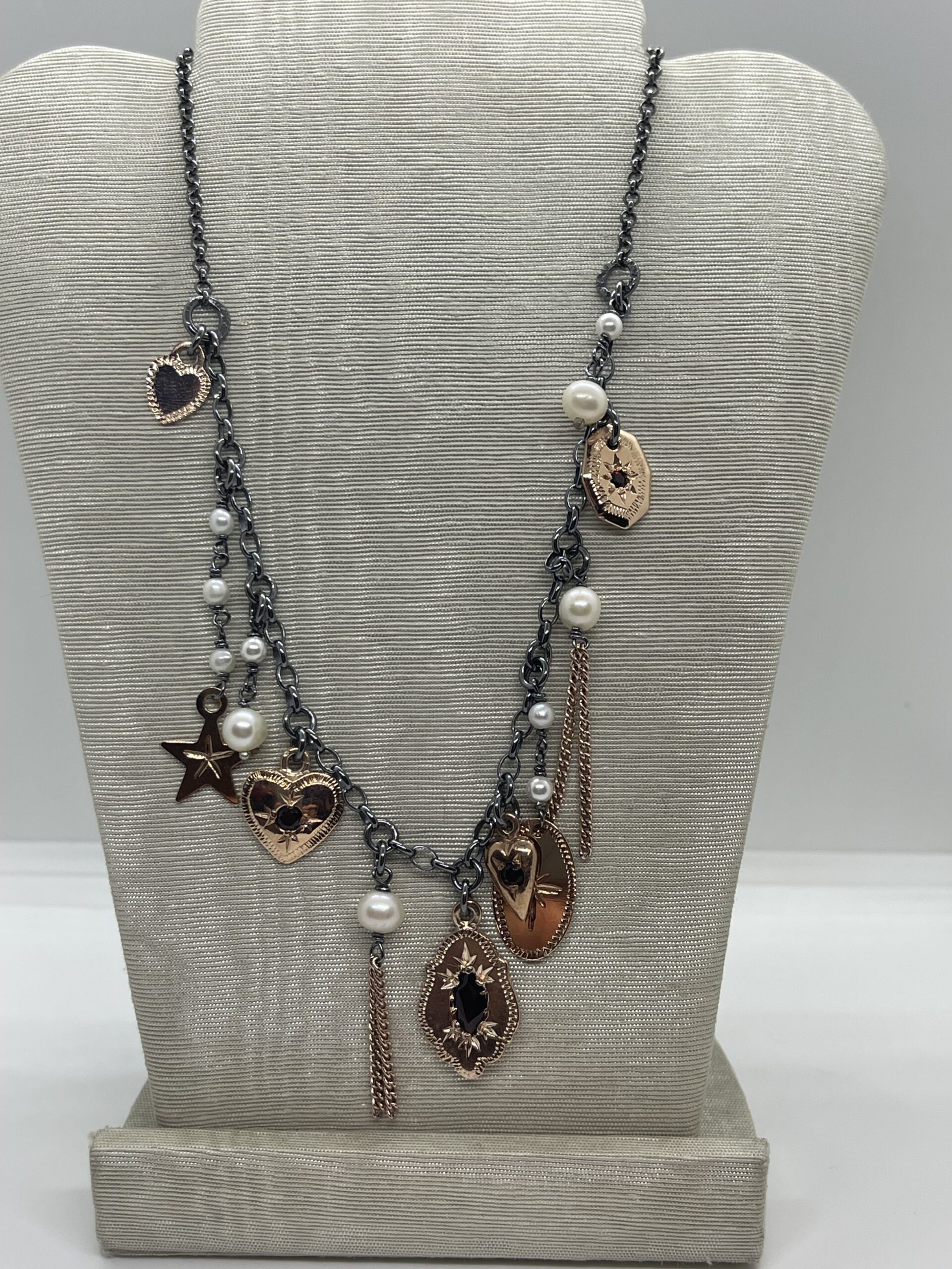 Girocollo in argento 925/°°° brunito con ciondoli rose a cascata e perline di fiume. Lunghezza da 40 a 42 cm regolabile. Chiusura con moschettone. Realizzato a mano in Italia. Referenza CL3813