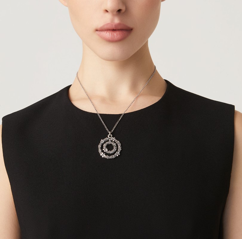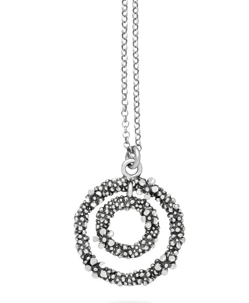 Collana in argento 925/°°° della collezione Millefiori con pendente a cerchi concentrici floreali. Chiusura con moschettone. Realizzato a mano in Italia. Lunghezza 45 cm regolabile con moschettone. Referenza 11698