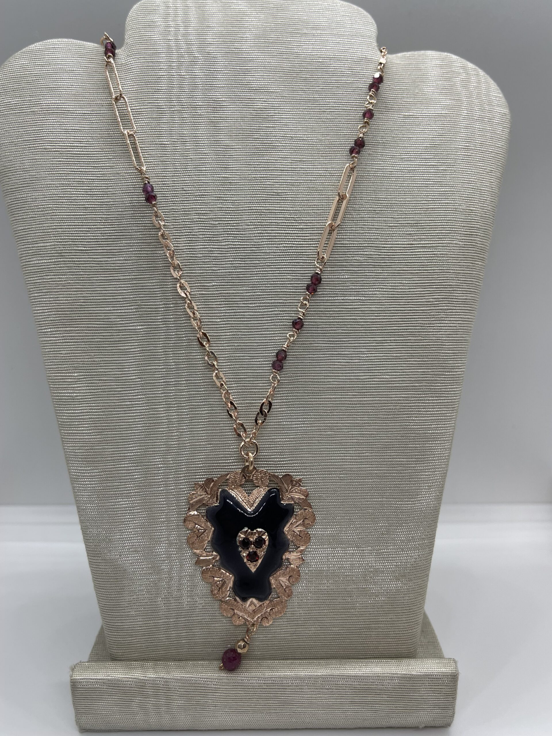Collana in argento 925/°°° rose gold con pietre naturali e cuore pendente smalto grigio antracite con granati. Chiusura con moschettone. Misura regolabile da 48 a 51 cm. Realizzato a mano in Italia.