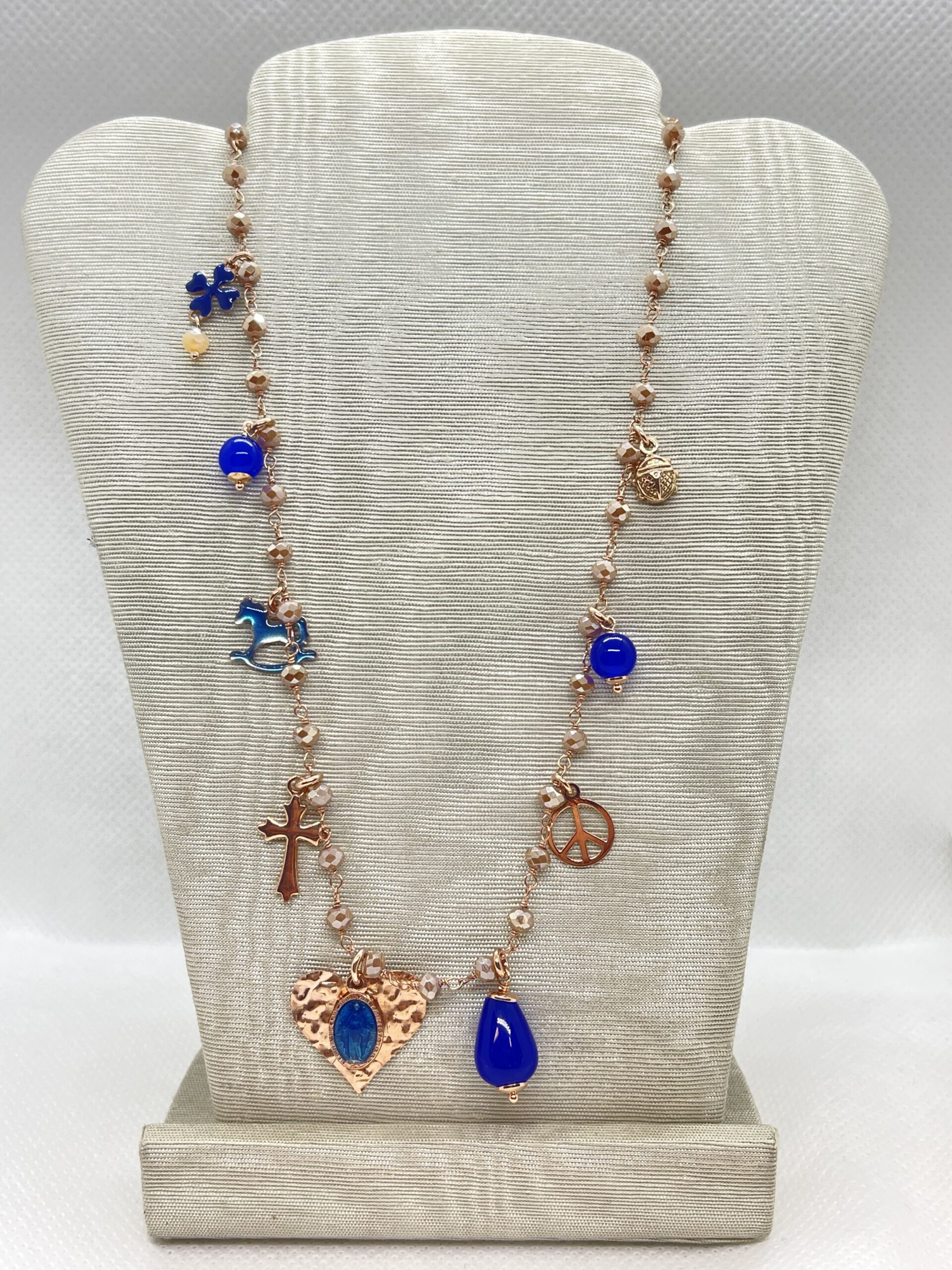 Collana argento rose  925/°°°  con spinelli chiari e vari ciondoli nelle tonalità del blu. Cuore martellato al centro. Lunghezza da 37 a 43 cm. Chiusura con moschettone. Realizzata in Italia.