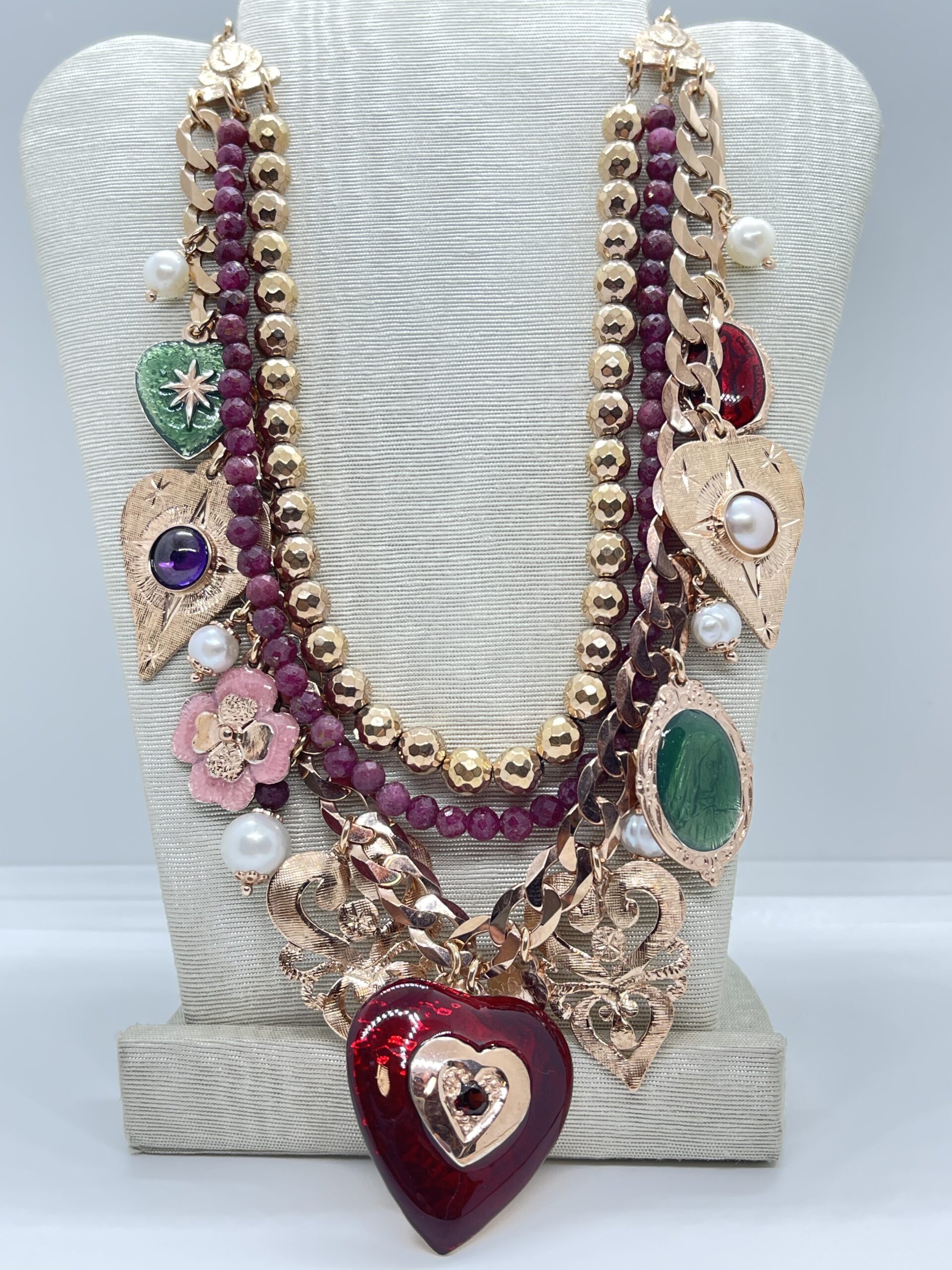 Collana in argento 925/°°° rose gold tre fili, con sfere martellate, pietre naturali rosse e catena barbazzale con pendenti vari smaltati. Chiusura con moschettone. Misura regolabile da 47 a 51 cm. Realizzato a mano in Italia.
