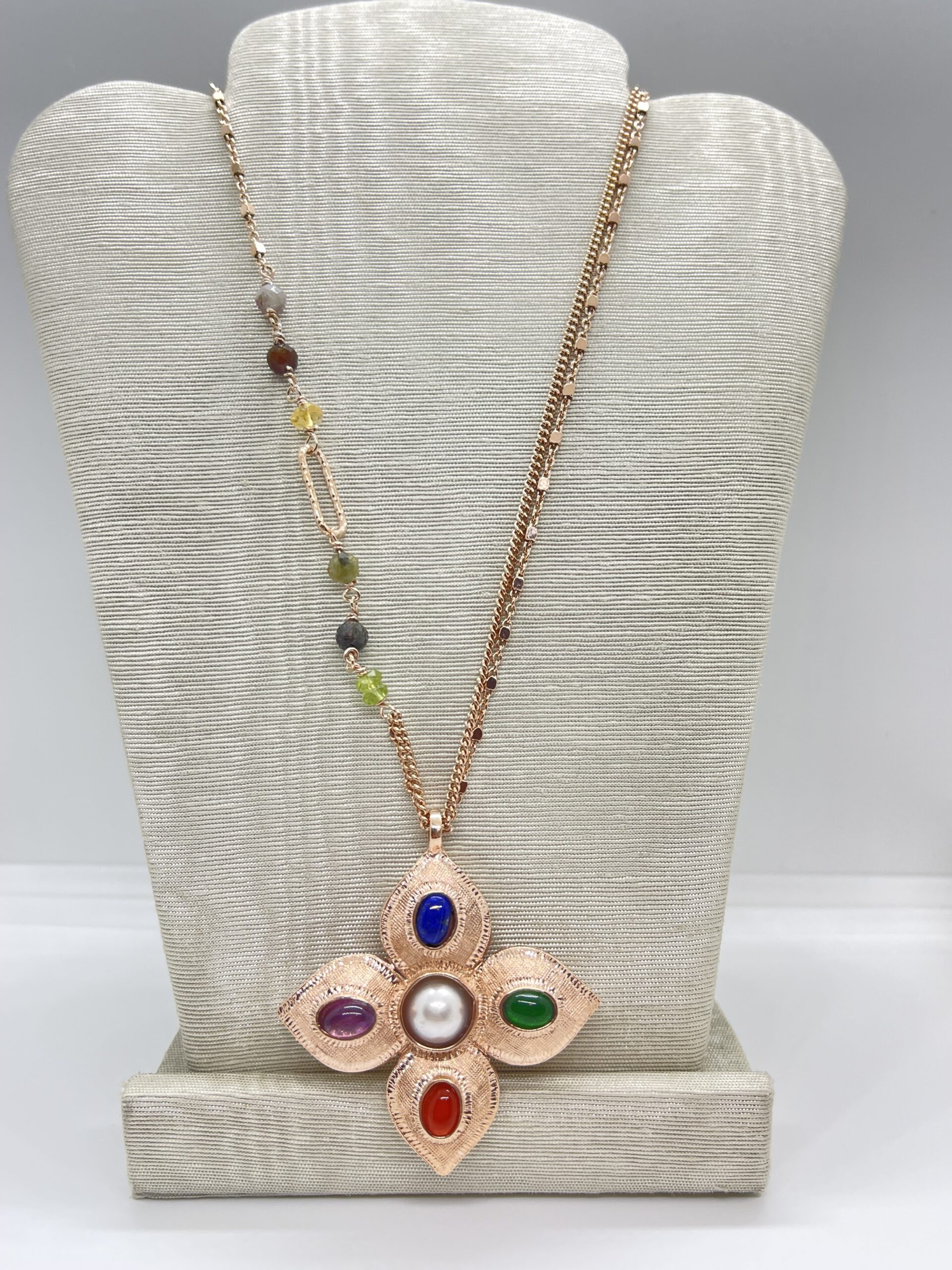 Collana in argento rose gold con pietre naturali e fiore pendente con pietre taglio cabochon colorate e perla mabè al centro. Chiusura con moschettone. Misura regolabile da 67 a 70 cm. Realizzato a mano in Italia.