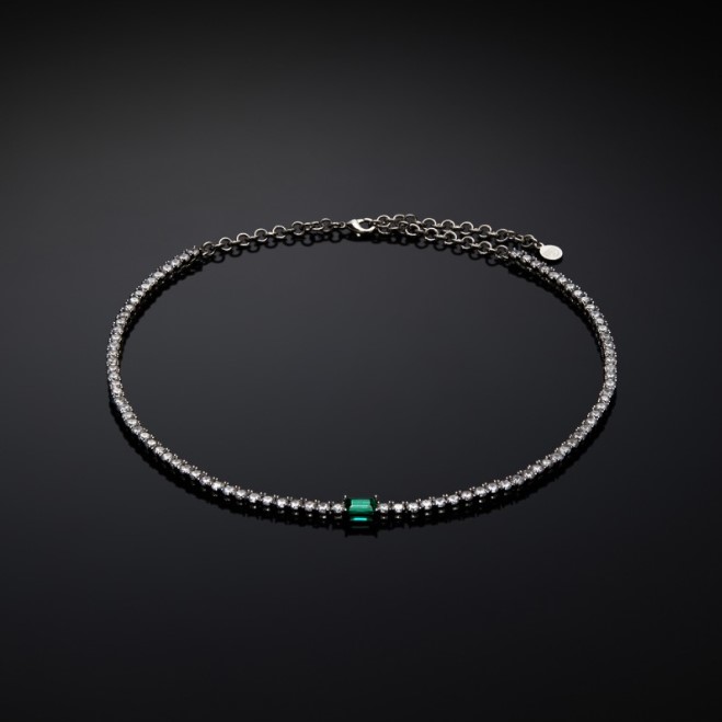 Collana Tennis in metallo placcato argento, lunghezza 38 + 4 cm, con zirconi bianchi e zircone verde taglio smeraldo centrale. Referenza J19AWJ13