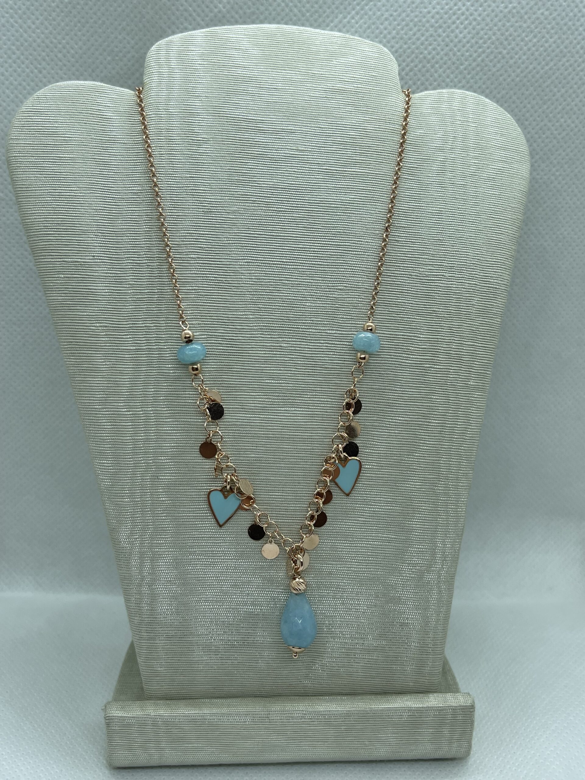 Collana argento rose 925/°°° con Goccia azzurra e cuori smalto celeste. Lunghezza regolabile da 49 a 53 cm. Chiusura con moschettone. Realizzata in Italia.