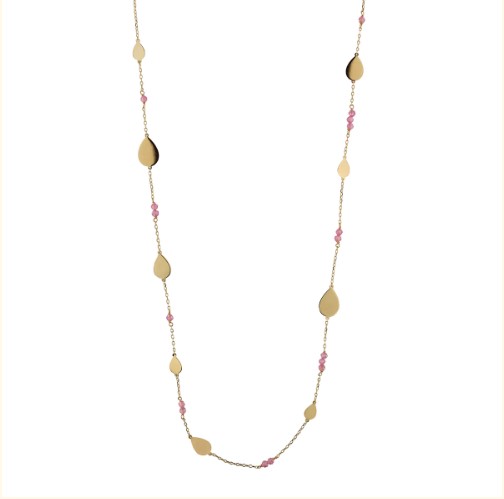 Collana lunga in argento 925/°°° placcato oro giallo 18kt con gocce lisce di varie misure e pietre rosa. Lunghezza 90 cm. Chiusura con moschettone. Collezione Dancing Drop.