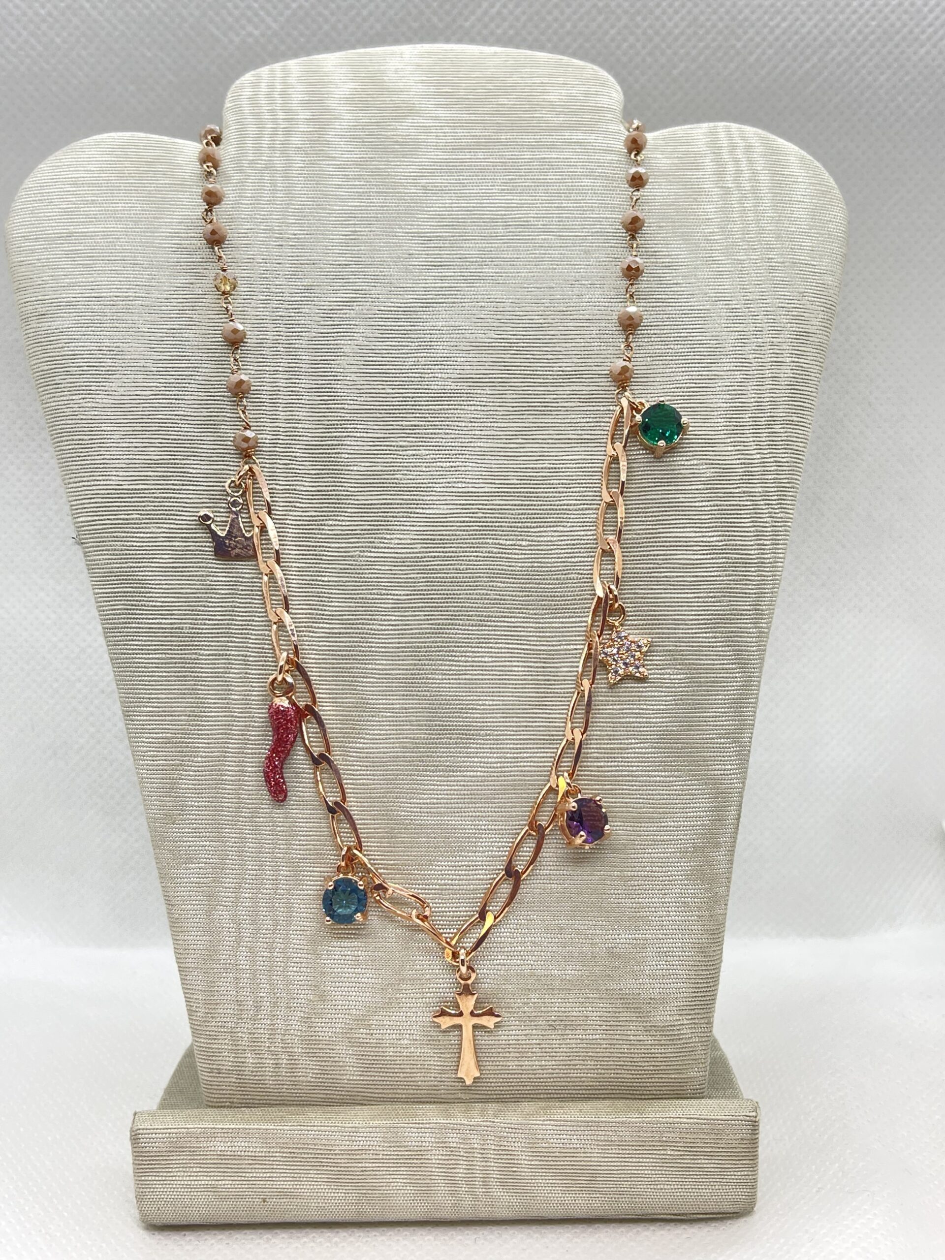 Collana argento rose 925/°°° con spinelli chiari e vari ciondoli. Tre punti luce colorati, verde viola e azzurro. Lunghezza da 37 a 43 cm. Chiusura con moschettone. Realizzata in Italia.