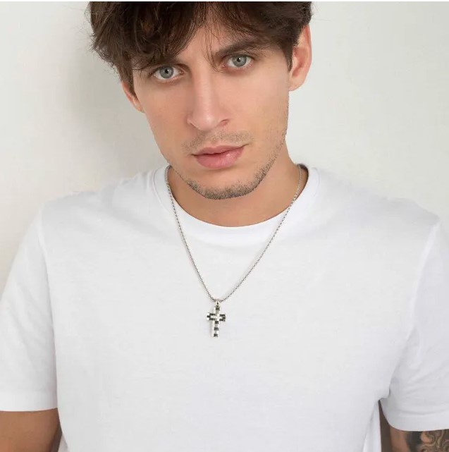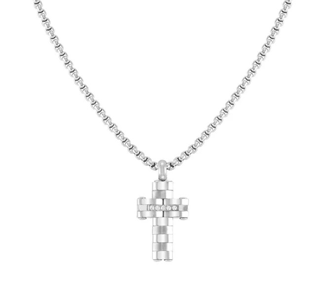 Collana in acciaio 316/304 con croce pendente con 5 diamanti bianchi. Lunghezza 50 cm.