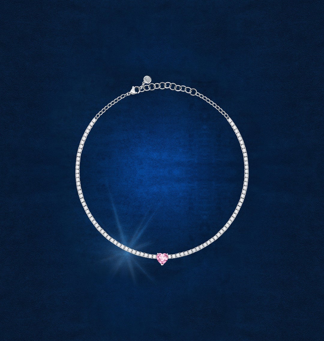 Collana tennis con zirconi con lunghezza regolabile 37 cm + 5 in metallo placcato rodio della collezione First Love. Zircone centrale rosa taglio cuore. Referenza J19AUV5