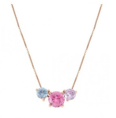 Collana in argento rose gold 925/°°° con trilogy di zirconi colorati. Lunghezza regolabile da 40 a 46 cm. Chiusura con moschettone.