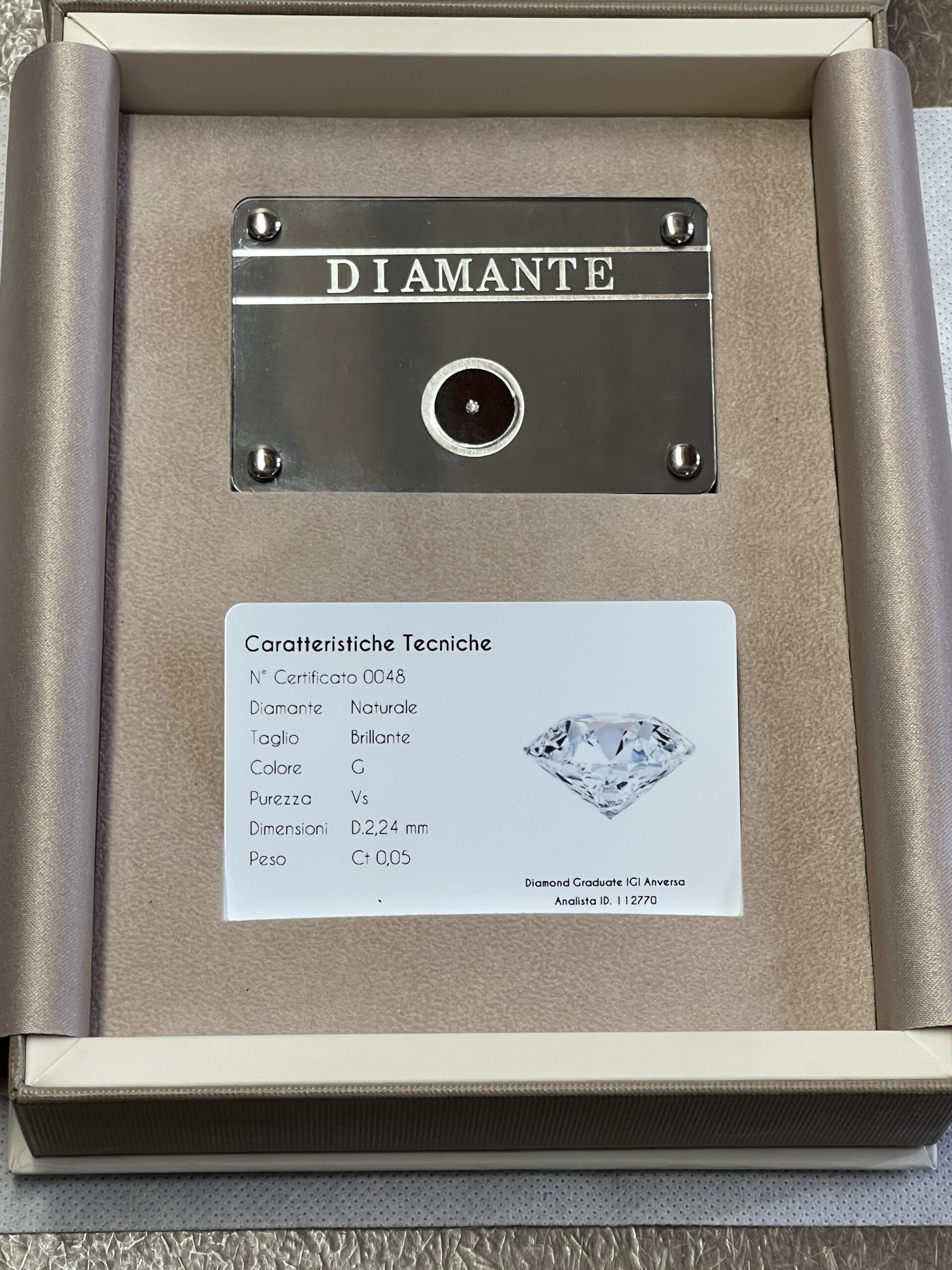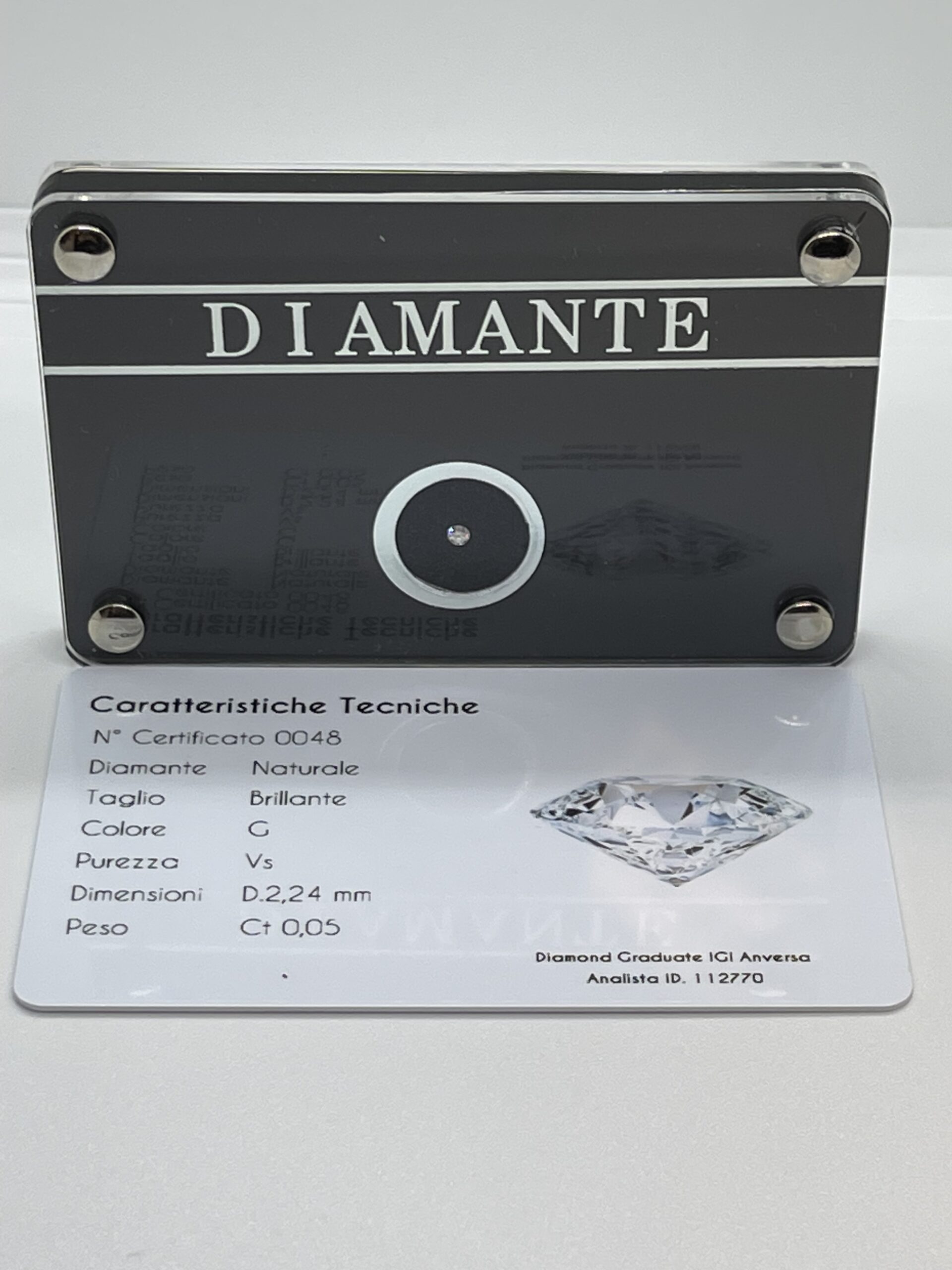 Diamante naturale taglio brillante. Caratura Pietra 0,05 ct. Colore G. Purezza VS. Blister sigillato corredato di certificato gemmologico in card. Con elegante confezione regalo beige.