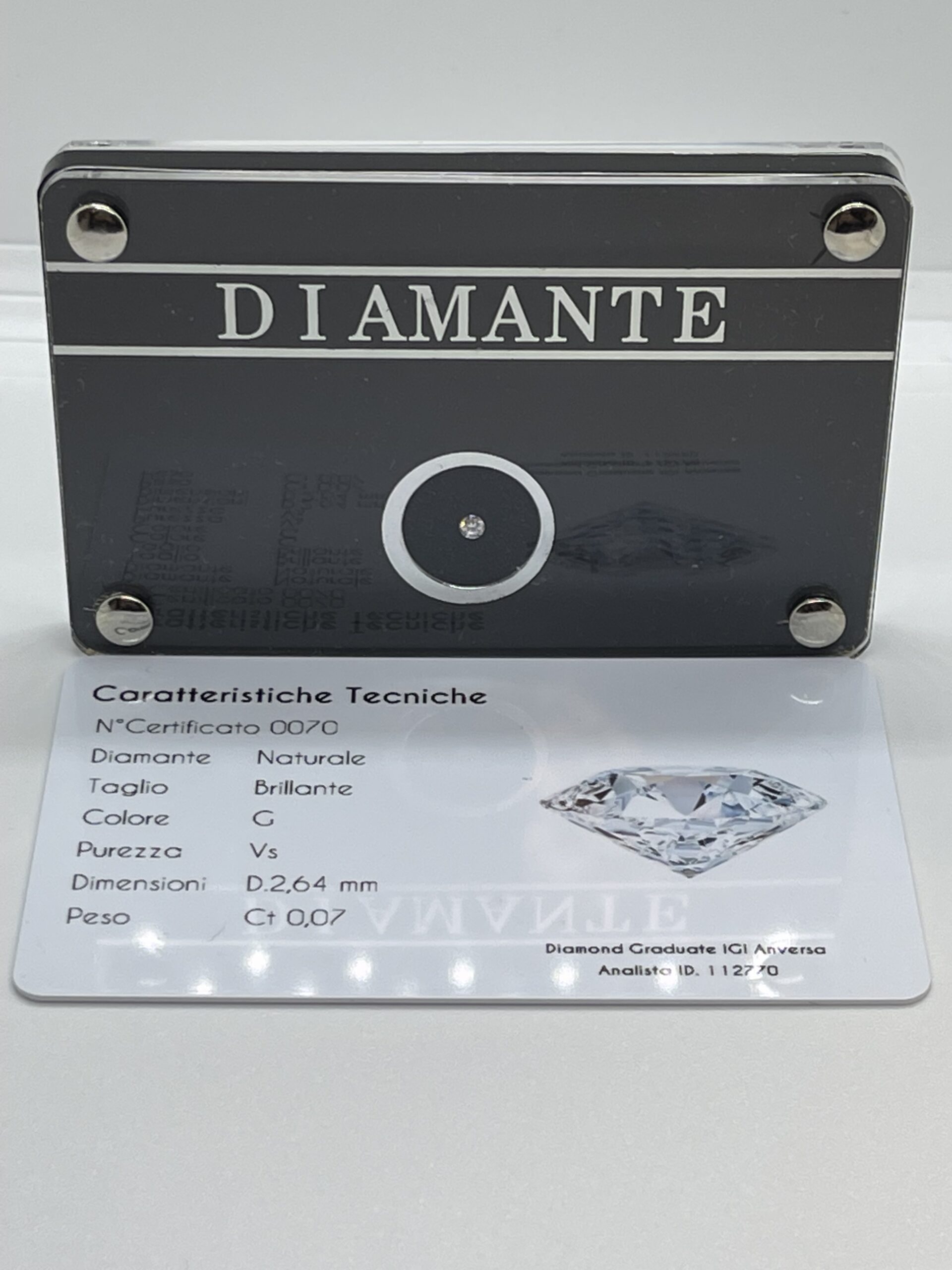 Diamante naturale taglio brillante. Caratura Pietra 0,07 ct. Colore G. Purezza VS. Blister sigillato corredato di certificato gemmologico in card. Con elegante confezione regalo beige.