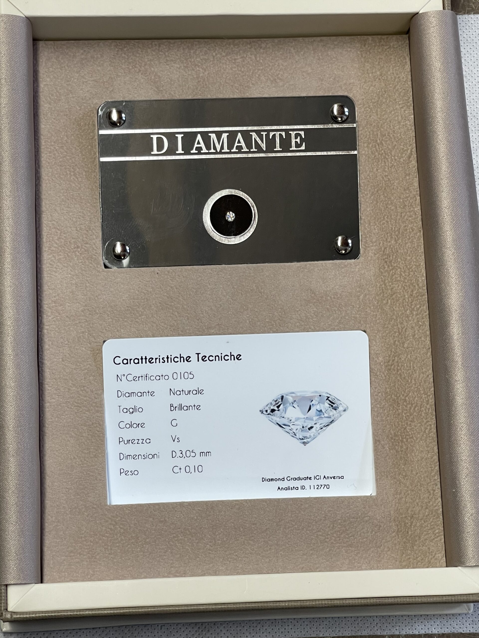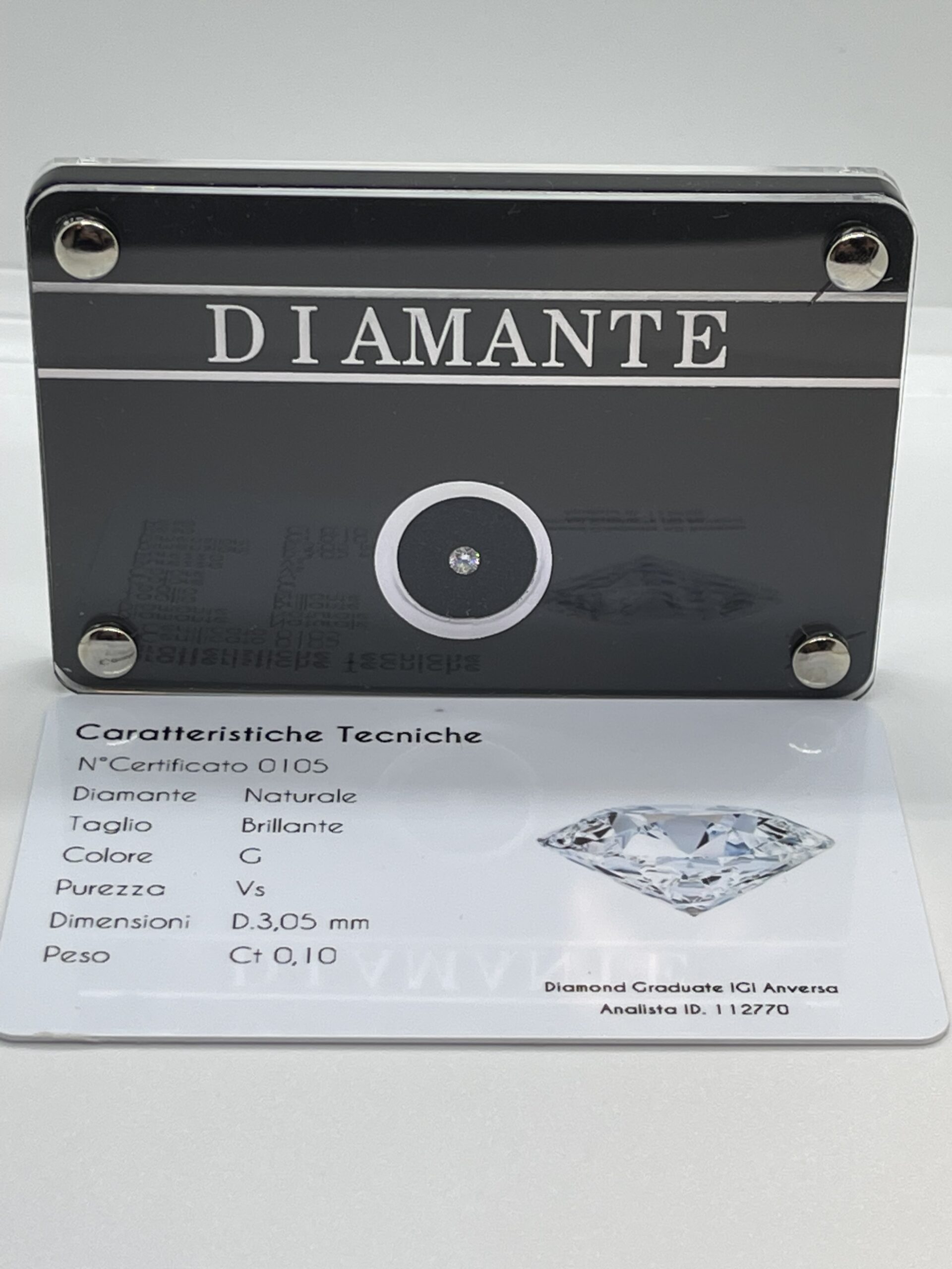 Diamante naturale taglio brillante. Caratura Pietra 0,10 ct. Colore G. Purezza VS. Blister sigillato corredato di certificato gemmologico in card. Con elegante confezione regalo beige.