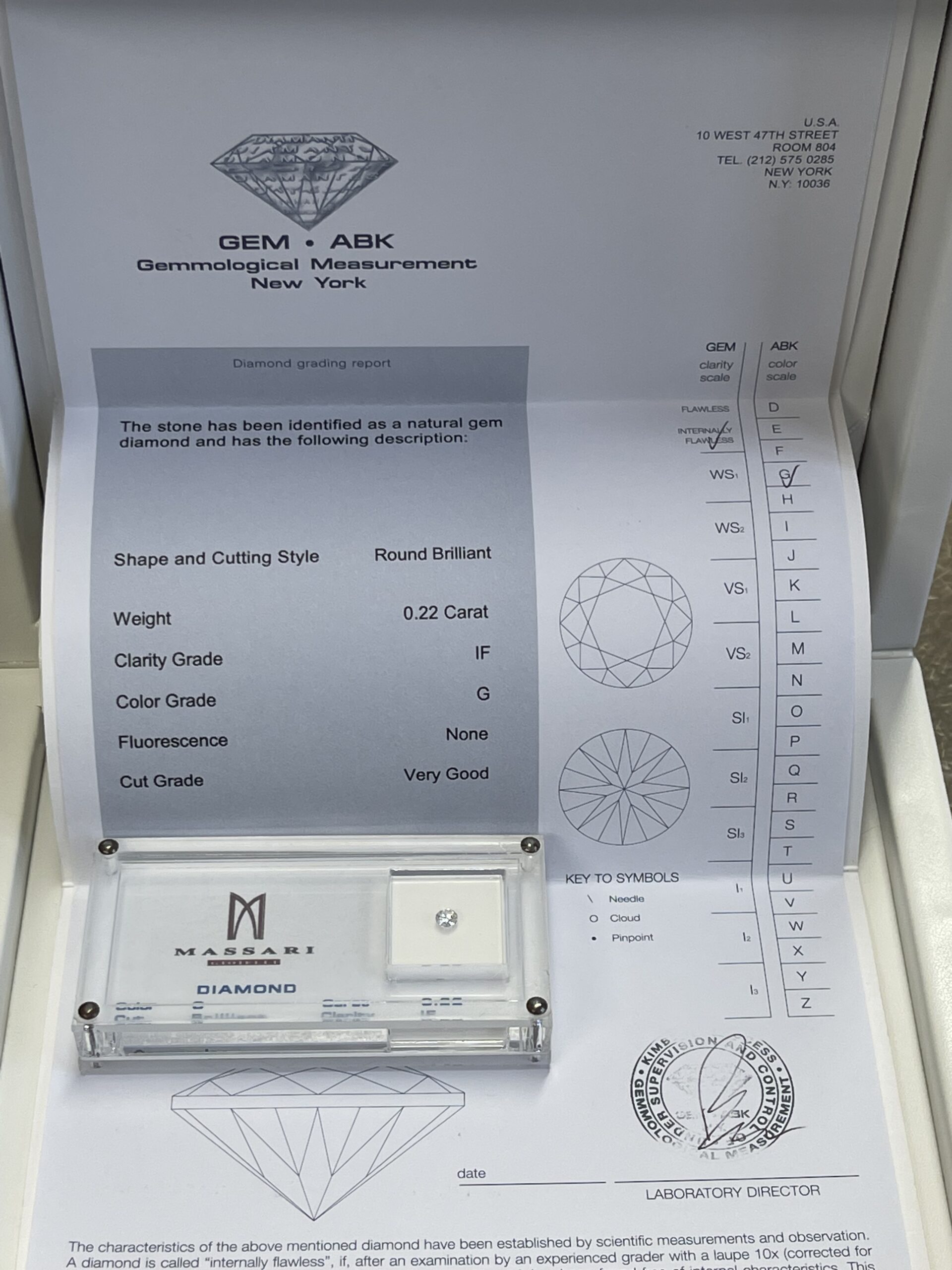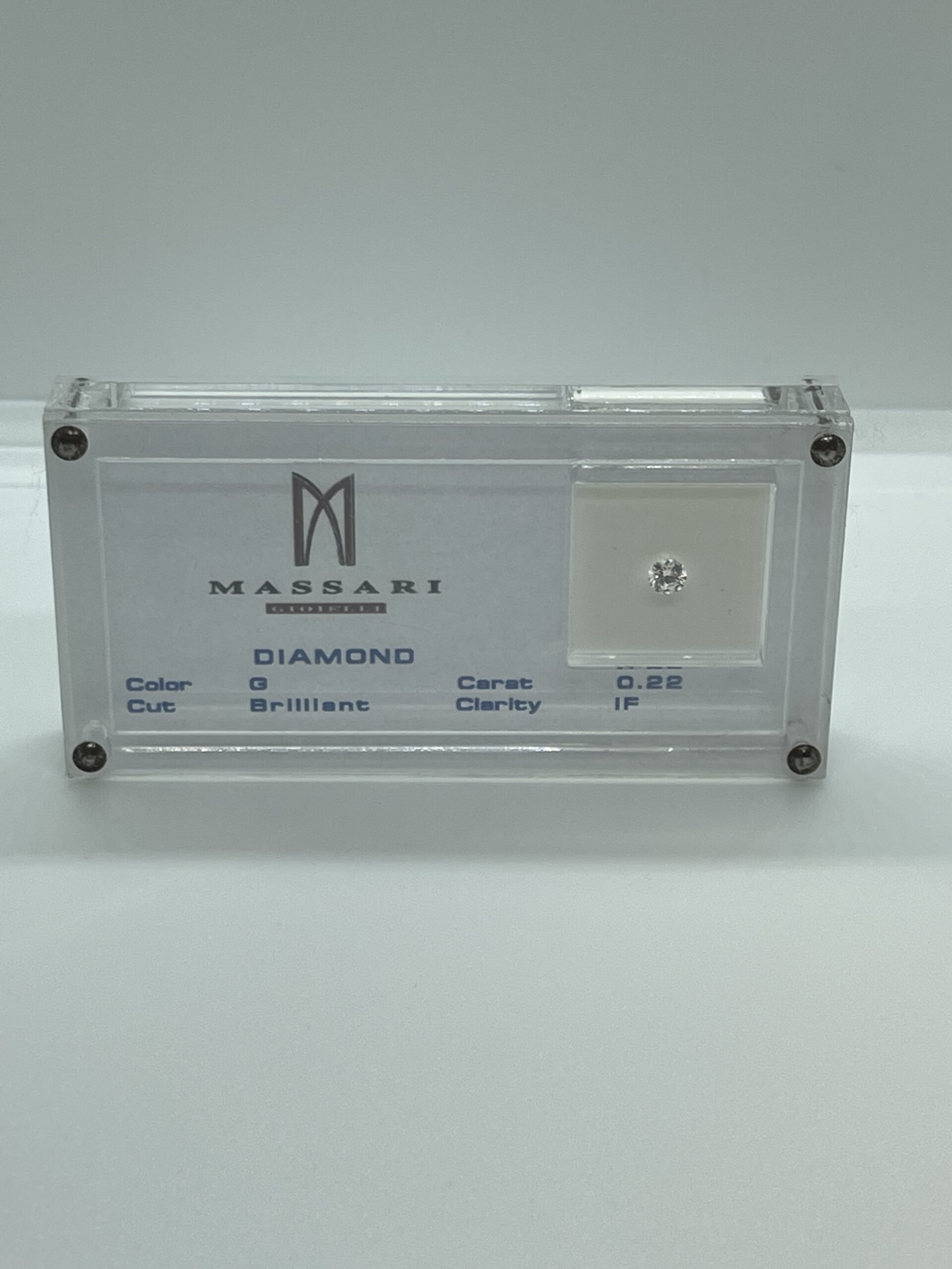 Diamante naturale taglio brillante. Caratura Pietra 0,22 ct. Colore G. Purezza IF (Internally Flawless-Puro Internamente). Blister sigillato corredato di certificato gemmologico con caratteristiche della pietra compreso grafico del diamante e grado di taglio (Very Good). Con elegante confezione regalo bianca.
