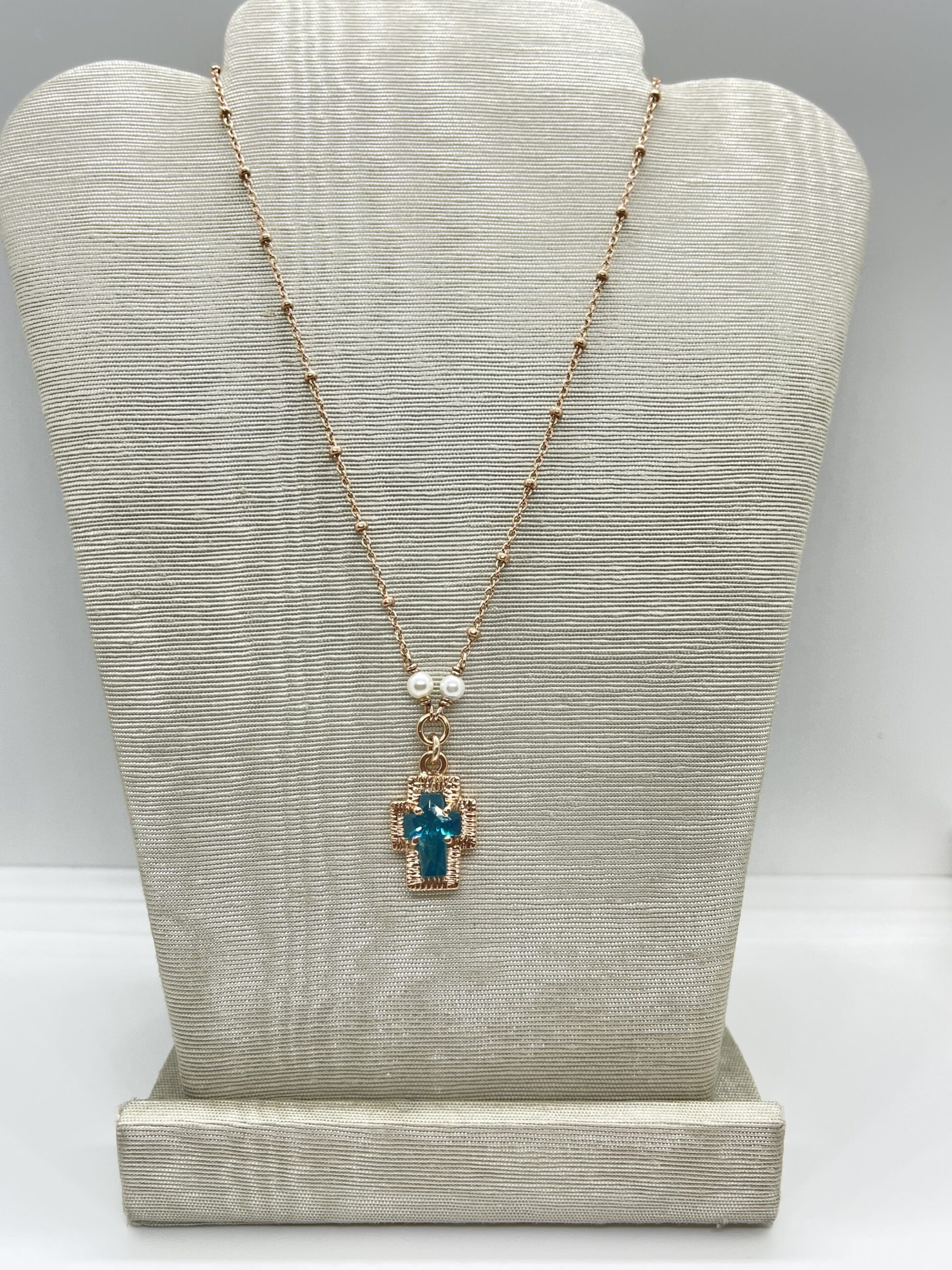Girocollo in argento 925/°°° rose gold con croce pendente e pietra verde acqua incastonata. Chiusura con moschettone. Misura regolabile da 45 a 47 cm. Realizzato a mano in Italia.