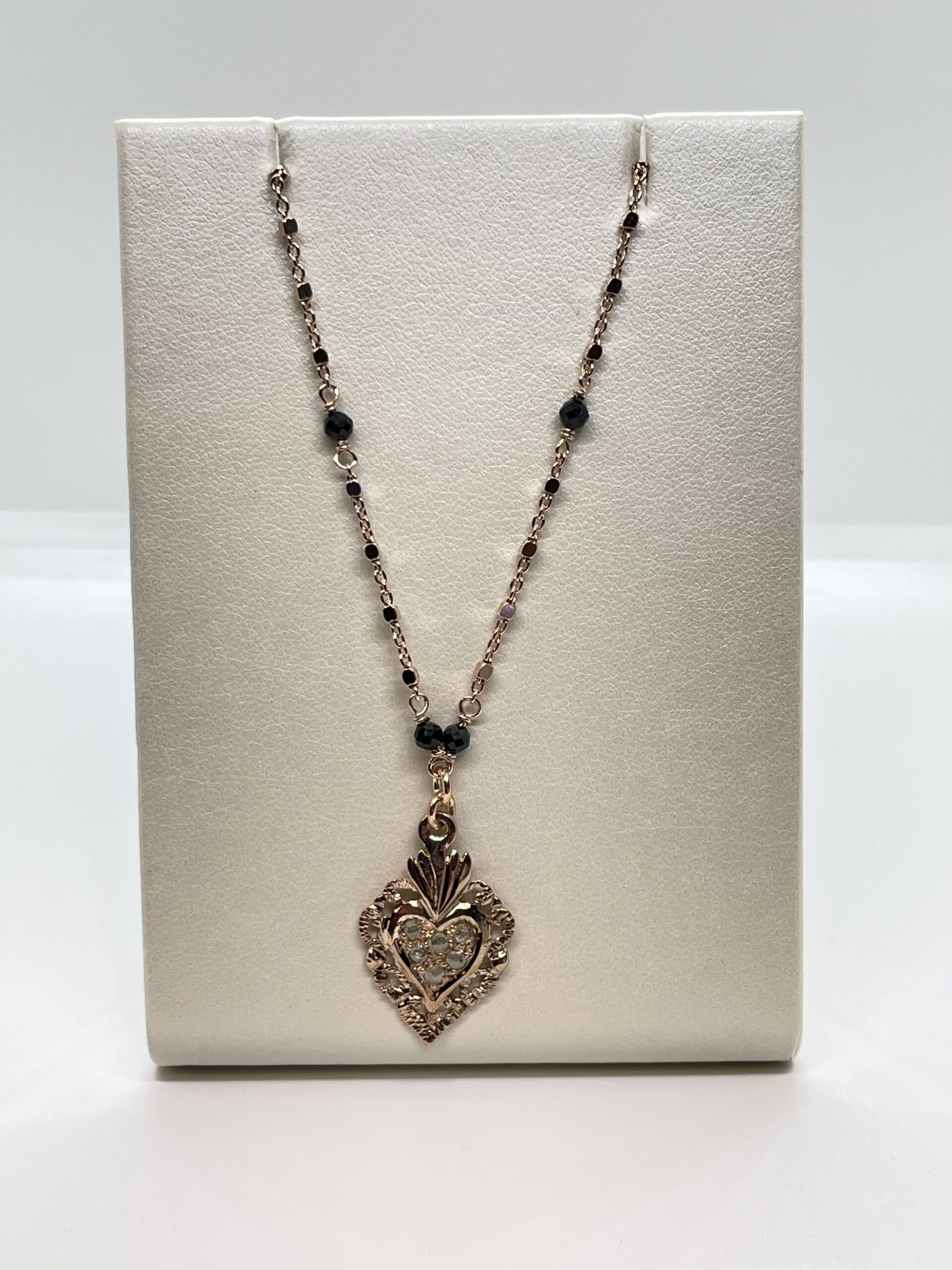 Girocollo in argento rose 925/°°° con pietre nere lungo la catena. Cuore Ex Voto centrale con rosette di diamanti. Lunghezza regolabile da 38 a 42 cm. Chiusura con moschettone. Realizzato a mano in Italia. Referenza CL3630/3