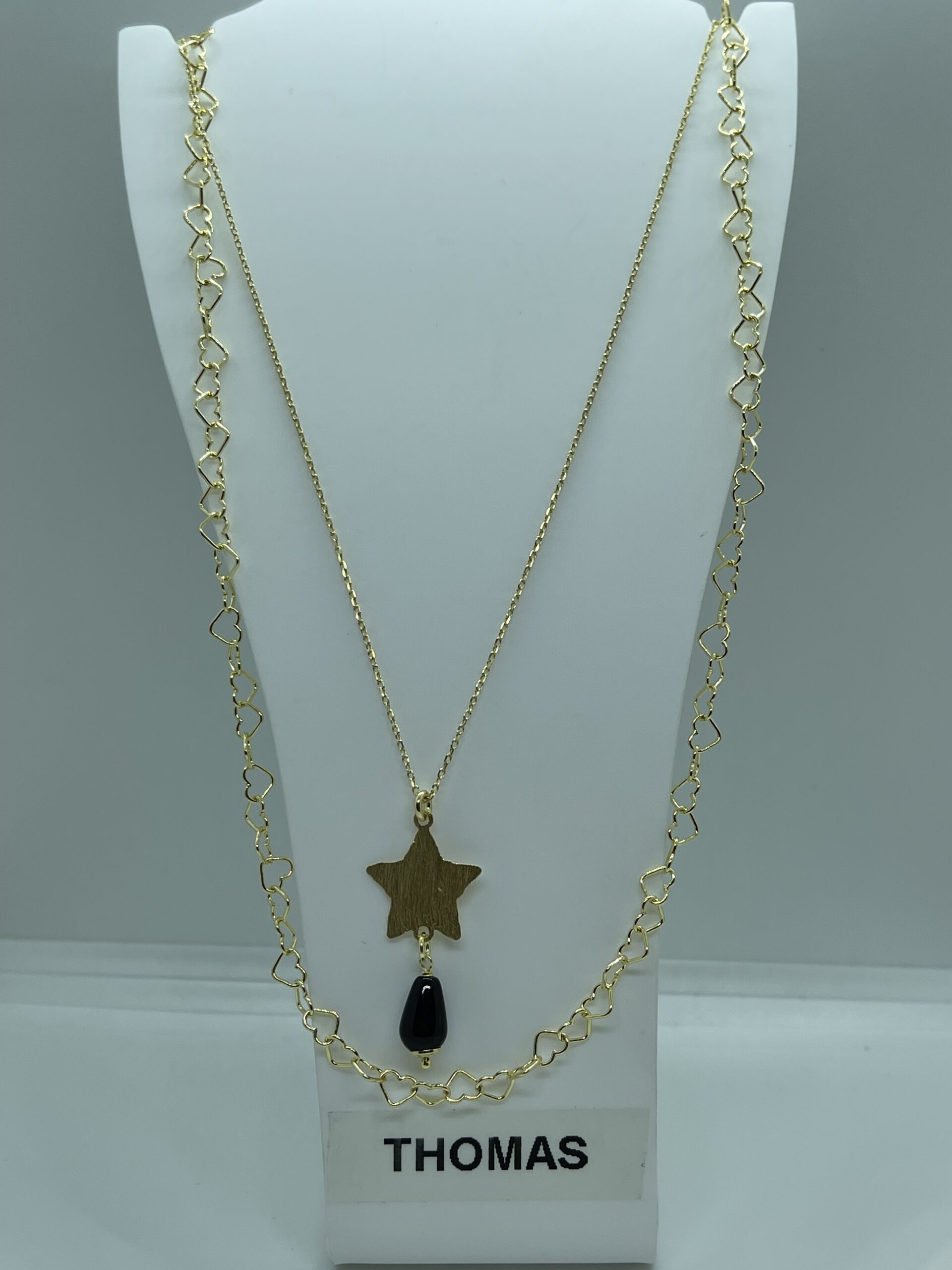 Girocollo in argento gold 925 doppio filo con un filo catena di cuori ed un filo con stella pendente e goccia nera . Lunghezza regolabile da 37 a 43 cm