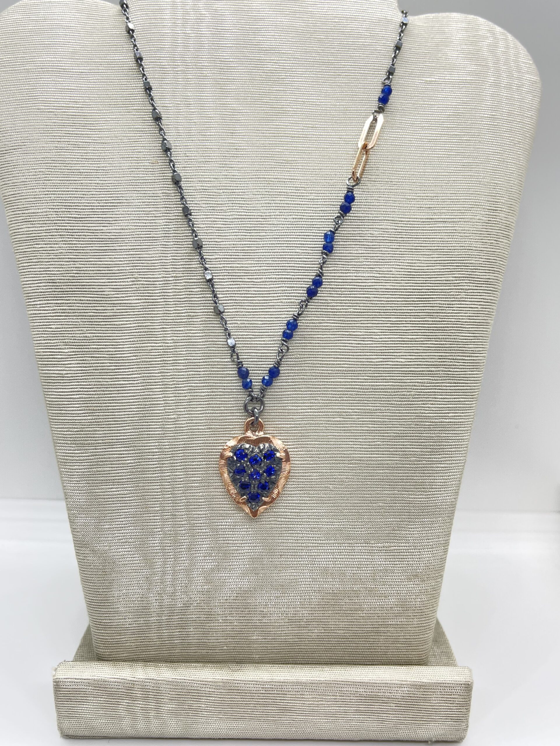 Girocollo in argento 925/°°° brunito con radici di zaffiro e ciondolo pendente in argento rose gold con pietre blu pavè. Chiusura con moschettone. Misura regolabile da 45 a 47 cm. Realizzato a mano in Italia.