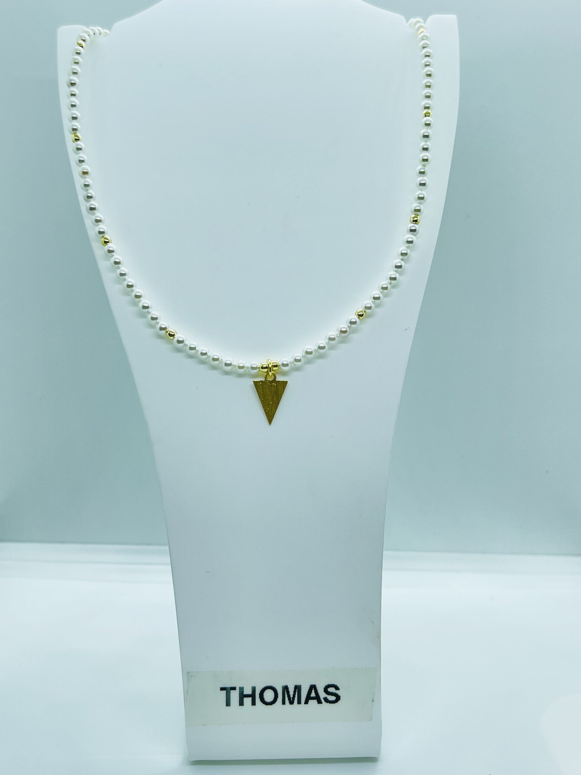 Girocollo in argento gold 925 con perline di fiume e pendente triangolo lavorazione graffiata. Lunghezza regolabile da 34 a 40 cm.