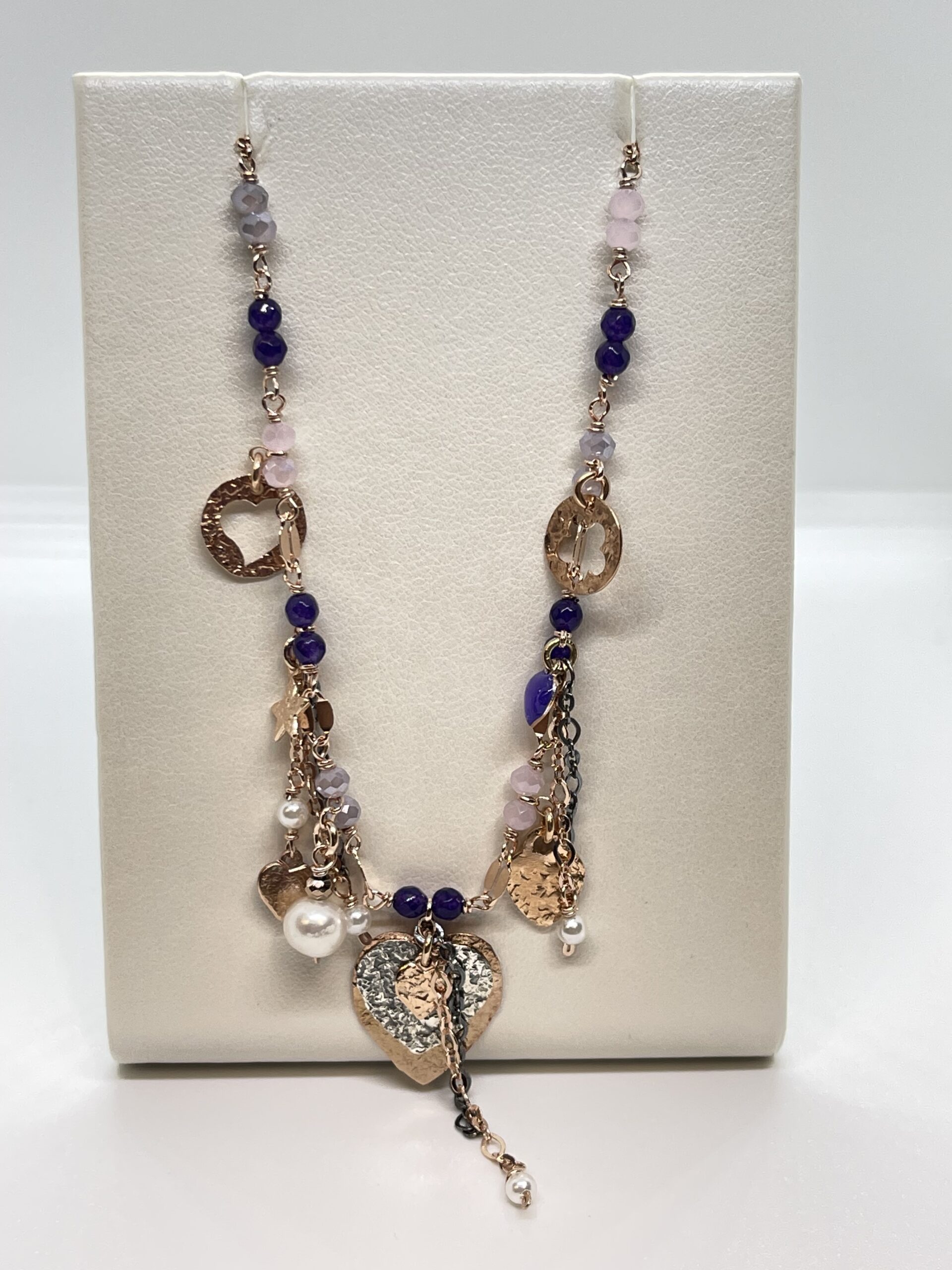 Girocollo in argento rose 925/°°° con cuori pendenti e pietre dure viola e rosa. Lunghezza regolabile da 38 a 42 cm. Chiusura con moschettone. Realizzato a mano in Italia. Referenza CL3630/3