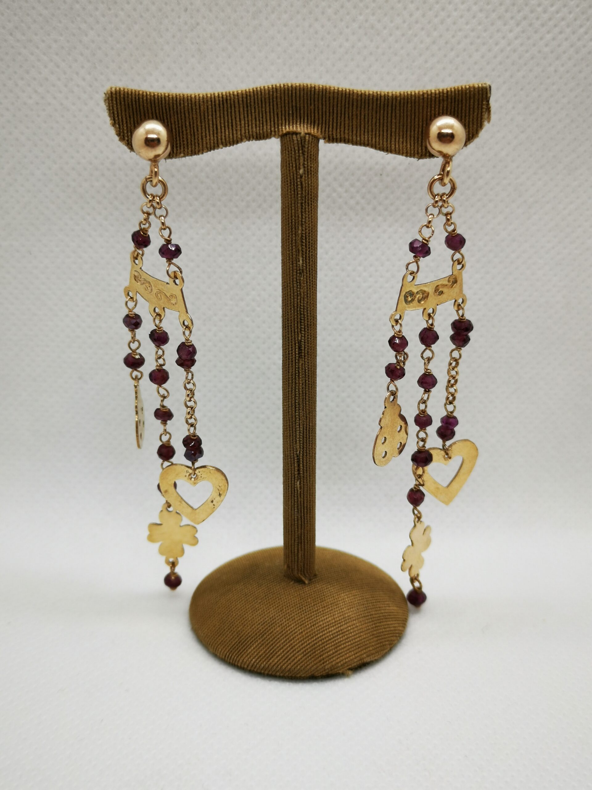 Orecchini in argento rose gold 925/°°° con spinelli colorati e pendenti portafortuna. Coccinella, quadrifoglio e cuore.