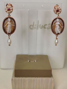 Orecchini pendenti in argento rose gold 925/°°° con chiusura a farfallina. Cameo naturale con donna figura completa e perline di fiume