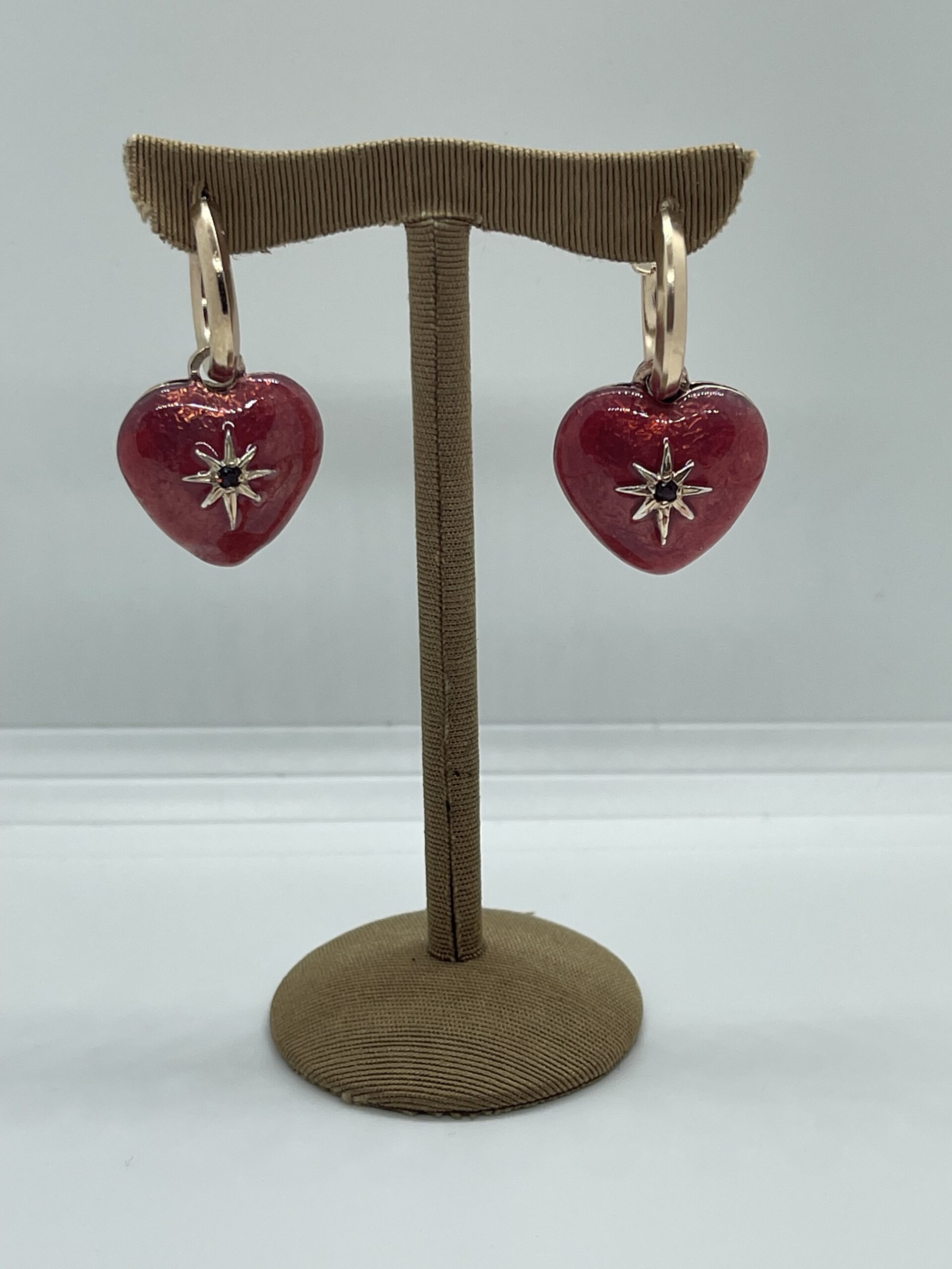 Orecchini Cerchio in argento 925/°°° rose gold con pendente cuore in argento rose smalto magenta e granato al centro. Realizzato a mano in Italia. Referenza OR2330
