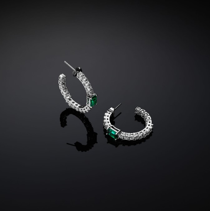 Orecchini cerchio in metallo placcato argento, diametro 30 mm, con zirconi bianchi e zircone verde taglio smeraldo centrale. Chiusura con farfallina. Referenza J19AWJ14