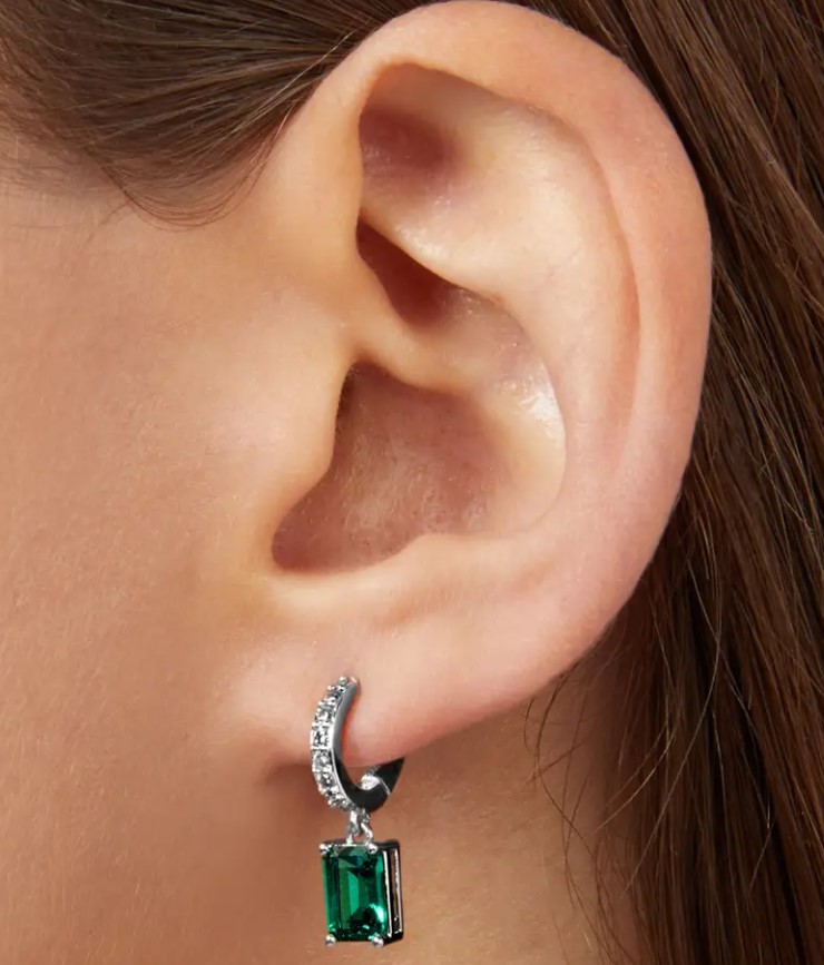 Orecchini cerchio in metallo placcato rodio con zirconi bianchi e zircone verde taglio smeraldo. Chiusura a farfallina.  Referenza J19AWJ16