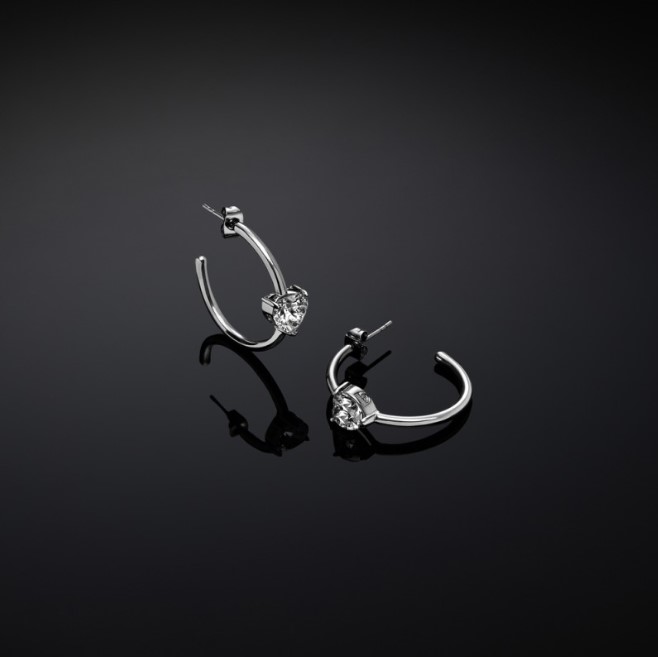 Orecchini cerchio in metallo placcato rodio, diametro 28 mm, con zirconi bianchi a forma di cuore. Referenza J19AWJ08
