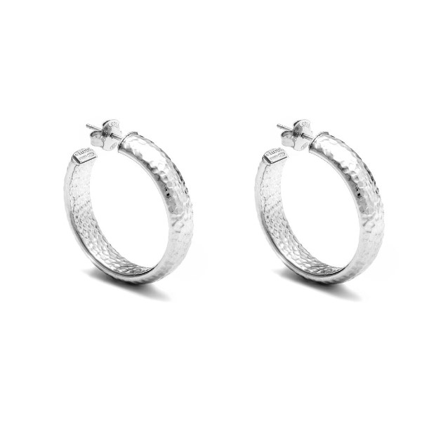 Orecchini cerchio in argento 925/°°° della collezione Moon Rock. Chiusura perno e farfallina. Peso 6 singolo orecchino. Diametro 3 cm. Realizzato a mano in Italia. Referenza 10828