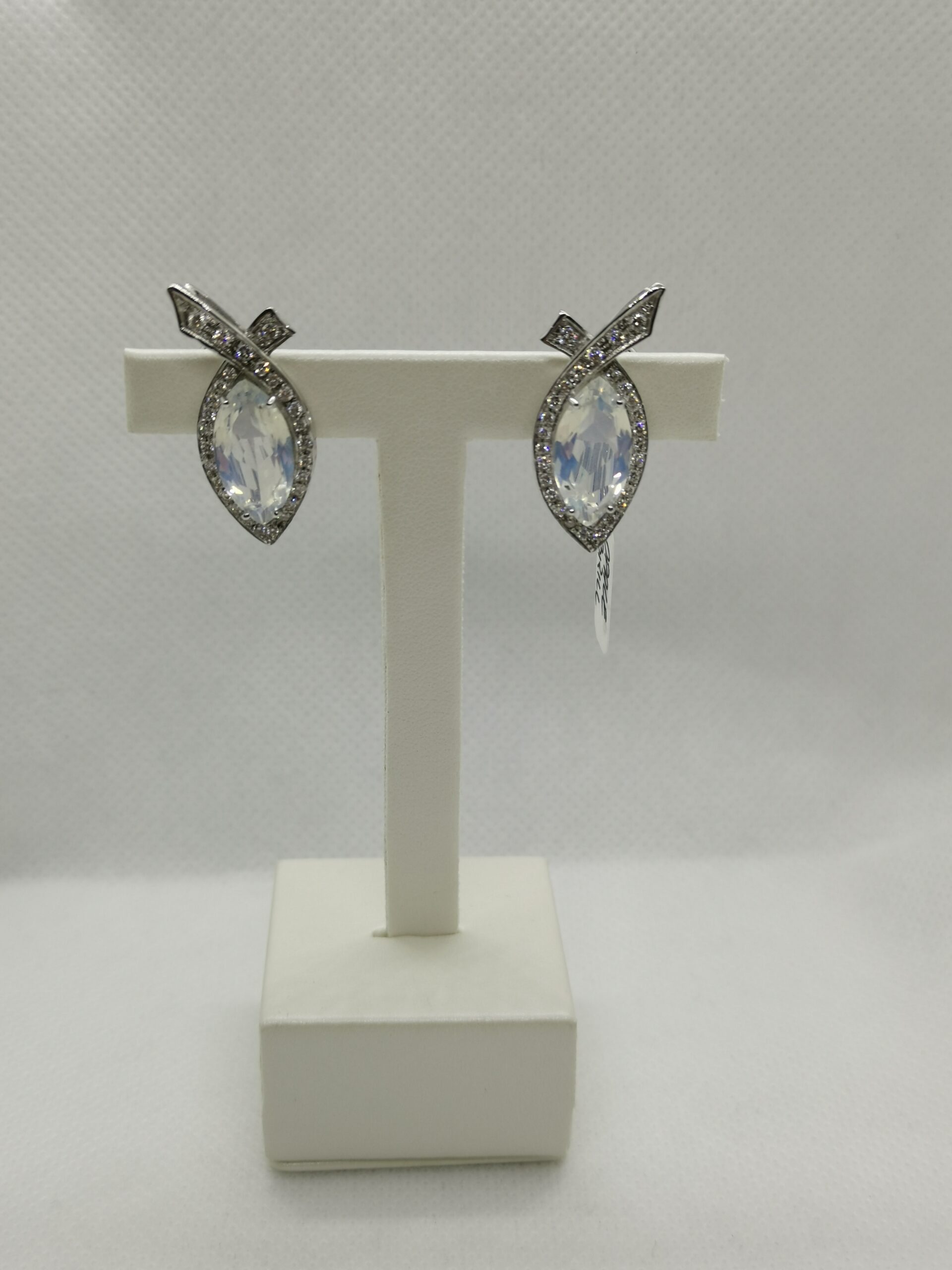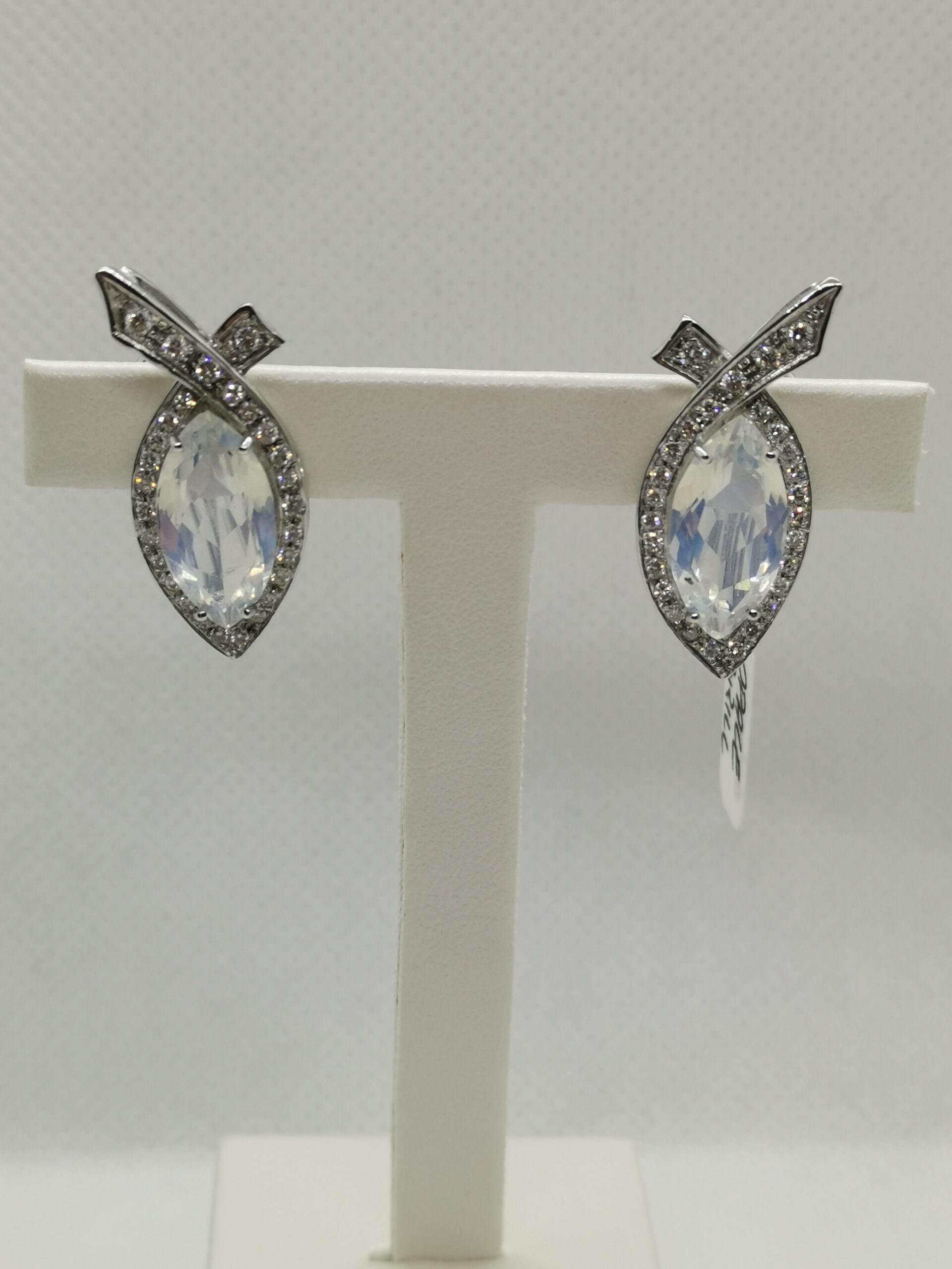 Orecchini in oro bianco 750/°°° con opale centrale e contorno di diamanti naturali taglio brillante. 10 grammi. Chiusura con pernio e clip. Garanzia ufficiale Massari Gioielli