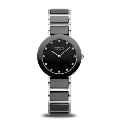 Orologio al quarzo in acciaio cassa 29 mm con ghiera in ceramica nera Hi-Tech. Impermeabilità 5 Atm. Vetro zaffiro. Bracciale in acciaio con inserti in ceramica neri. Quadrante nero con swarovski. Chiusura deployante. Garanzia 3 anni