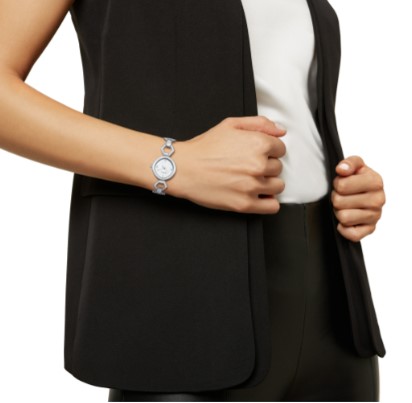 Orologio da donna in acciaio solo tempo. Cassa 24×25 mm. Quadrante bianco lavorato. Impermeabilità 3 atm. Vetro minerale.