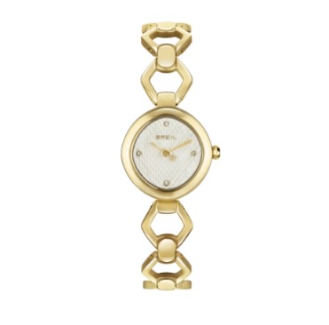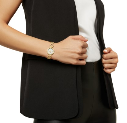 Orologio da donna in acciaio pvd gold solo tempo. Cassa 24×25 mm. Quadrante bianco lavorato. Impermeabilità 3 atm. Vetro minerale.