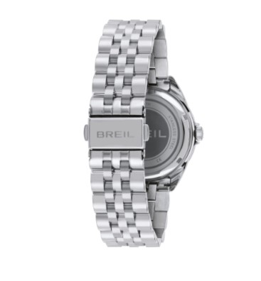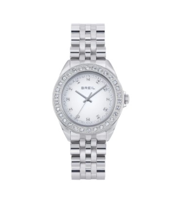 Orologio da donna in acciaio solo tempo cassa 36 mm. Quadrante argento con cristalli. Ghiera con cristalli. Impermeabilità 5 atm. Vetro minerale. Fibbia deployante.