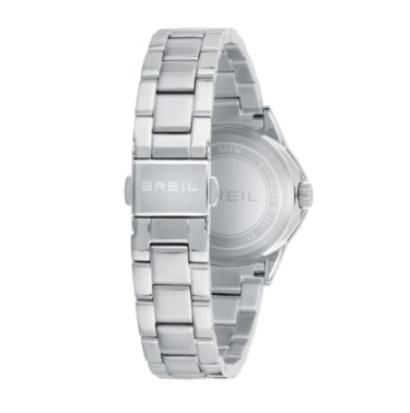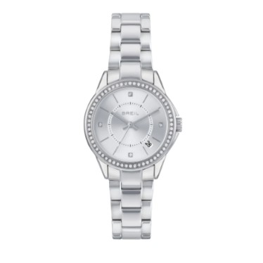 Orologio da donna in acciaio solo tempo cassa 31 mm. Quadrante argento con cristalli e datario. Ghiera con cristalli. Impermeabilità 5 atm. Vetro minerale. Fibbia deployante.