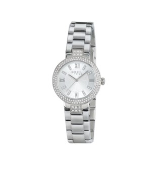 Orologio da donna in acciaio solo tempo cassa 32 mm. Quadrante argento con numeri romani e cristalli. Ghiera e inserti bracciale in acciaio con cristalli. Impermeabilità 5 atm. Vetro minerale. Fibbia deployante.