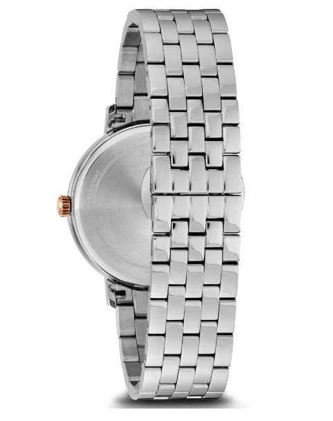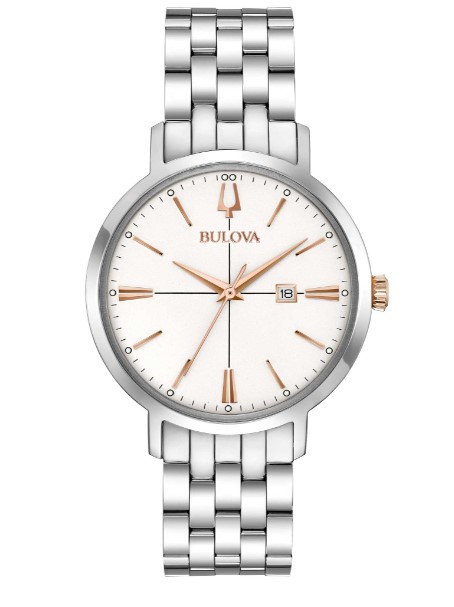Orologio al quarzo 3H. Cassa acciaio 35 mm. Bracciale acciaio con fibbia deployante. Quadrante bianco rifiniture rose. Water resistant. Vetro minerale. Con datario.