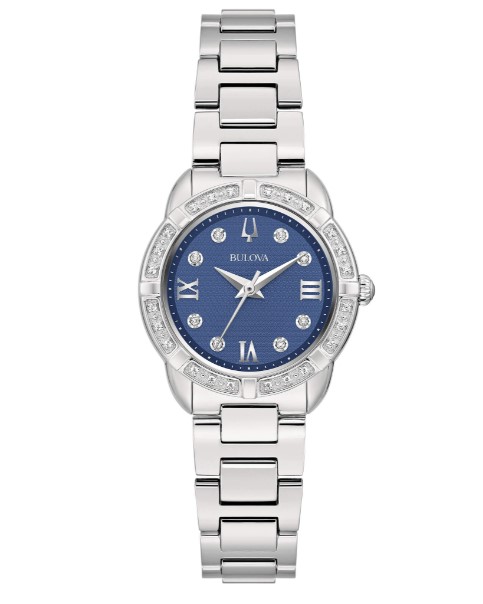 Orologio al quarzo 3H. Cassa acciaio 27mm. Bracciale acciaio. Quadrante Blu. Water resistant 3 Atm. Vetro minerale. Diamanti su ghiera e quadrante.
