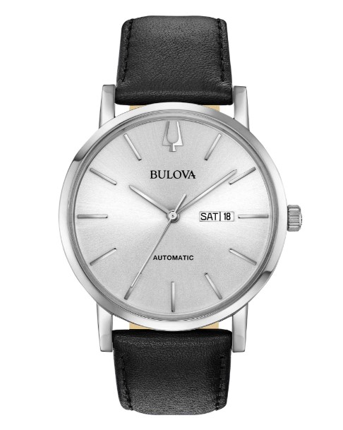 Orologio Automatico 40H riserva di carica day-date. Cassa acciaio 41mm. Cinturino pelle nera fibbia ardiglione. Quadrante argento. Water Resistant. Fondello a vite con movimento a vista.