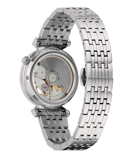 Orologio automatico 3H. Cassa acciaio 32 mm. Bracciale acciaio. Quadrante madreperla con lancette rose gold ed oblò vista movimento. Water resistant 3 Atm. Vetro zaffiro. Diamanti sul quadrante.
