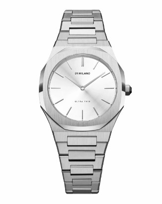 Orologio al quarzo in acciaio con cassa 34 mm. Quadrante argento soleil. Indici e lancette acciao. Impermeabilità 5 Atm. Vetro Zaffiro. Movimento Miyota