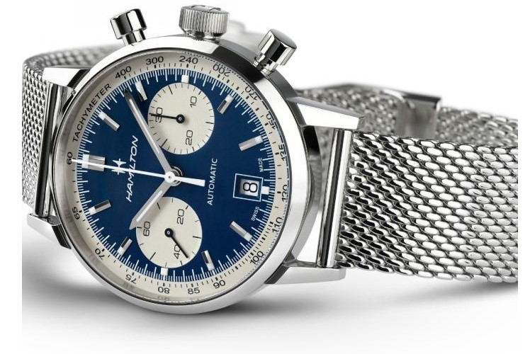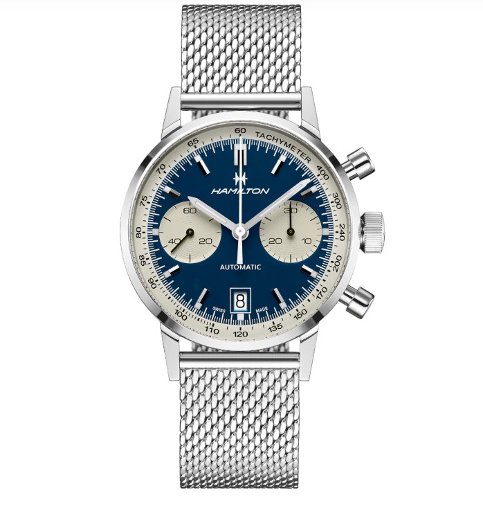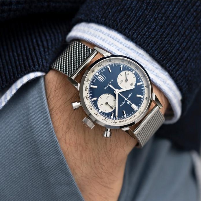 Orologio automatico cronografo Swiss Made, cassa in acciaio 40 mm con quadrante blu contatori crema e datario. Bracciale in acciaio maglia milano. Water Resistant 5 atm