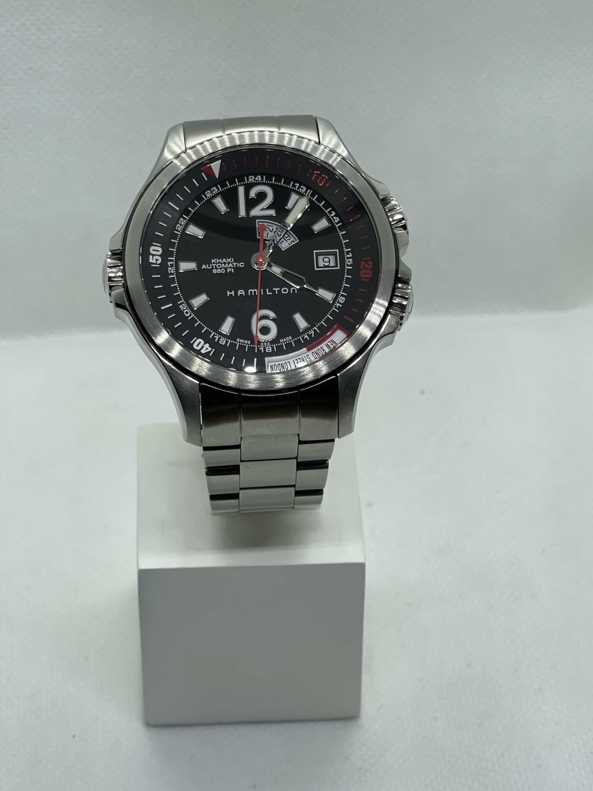 Orologio Hamilton GMT automatico cassa acciaio 44 mm. Quadrante nero con datario. Impermeabilità 200 metri. Bracciale acciaio con fibbia deployante. Vetro zaffiro. Senza documenti e scatola originale. Swiss Made. L’orologio viene consegnato revisionato con garanzia di 1 anno Massari Gioielli.