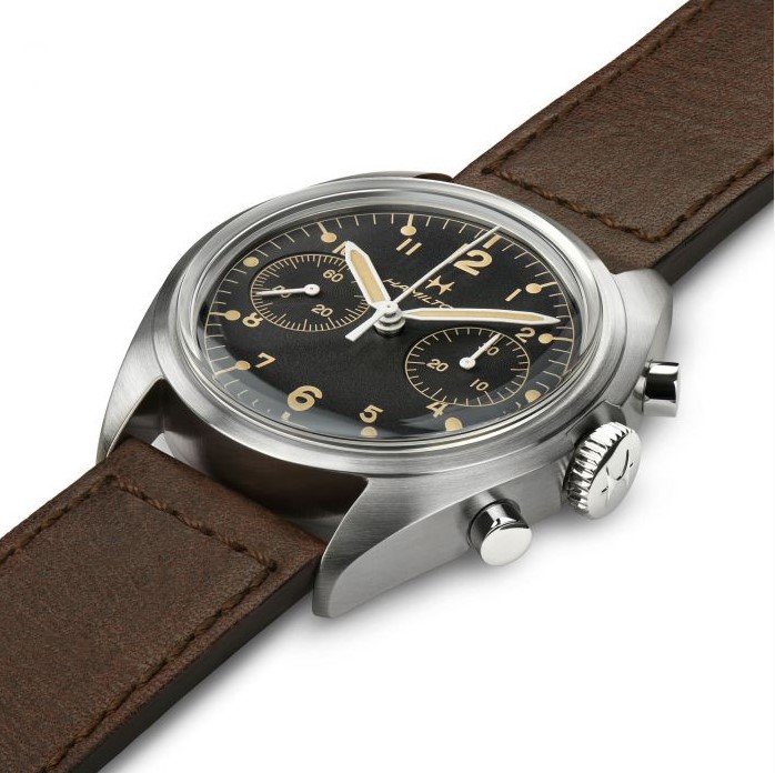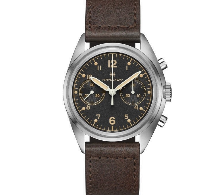 Orologio dal design vintage stile aviazione militare con quadrante nero e dettagli crema, movimento meccanico a carica manuale, cassa 40 mm, vetro zaffiro, cinturino in vacchetta marrone. Riserva di carica 60 ore, 10 atm impermeabilità.