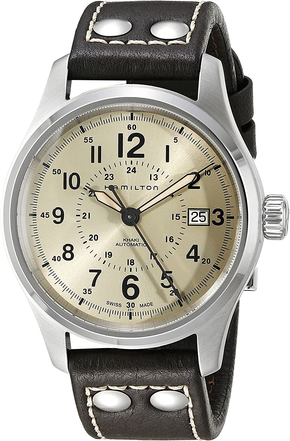 Orologio uomo automatico in acciaio con quadrante Khaky. Cinturino pelle marrone