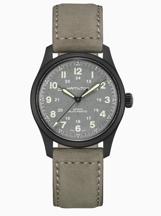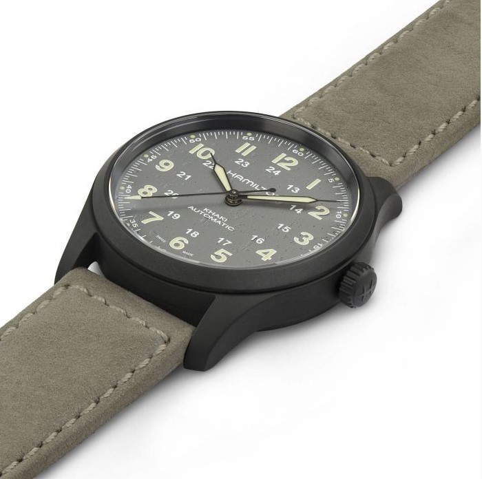 Orologio Automatico Swiss Made, vetro zaffiro, impermeabile 10 atm. Cassa in titanio black 38 mm. Cinturino pelle di vacchetta grigio con cuciture bianche. Quadrante grigio effetto granito.