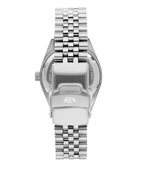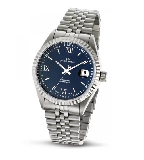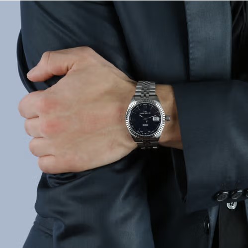 Orologio 3H da uomo cassa 39 mm al quarzo. Quadrante blu con numeri romani e datario. Lunetta zigrinata e bracciale jubilee. Impermeabilità 100 metri con corona a vite. Swiss Made