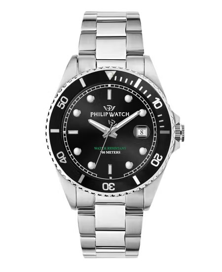 Orologio al quarzo Collezione Caribe cassa 42 mm con data. Impermeabile 100 metri con corona a vite. Lunetta nera quadrante nero con datario, vetro zaffiro, bracciale Oyster. Swiss Made
